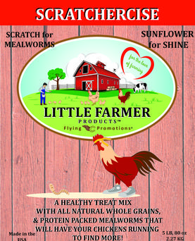 Scratchercise; will encourage your chickens to exercise while they enjoy a healthy scratch treat. Not only will your flock love the mealworms, but the additional protein they get will increase their energy which helps with egg production. We also use whole Non GMO grains such as wheat and field peas for maximum nutritional value! Sunflower and Safflower will add protein and make your birds feathers shine! We've included Flax which is another good protein source and high in Omega 3's for healthy eggs.